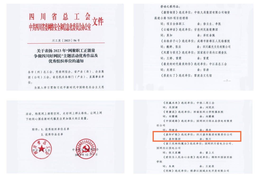 近日,四川省总工会下发《关于表扬2023年“网聚职工正能量争做四川好网民”主题活动优秀作品及优秀组织单位的通知》,由乐竞体育,乐竞(中国)报送的视频《嘉阳矿歌》获劳动之歌作品奖。