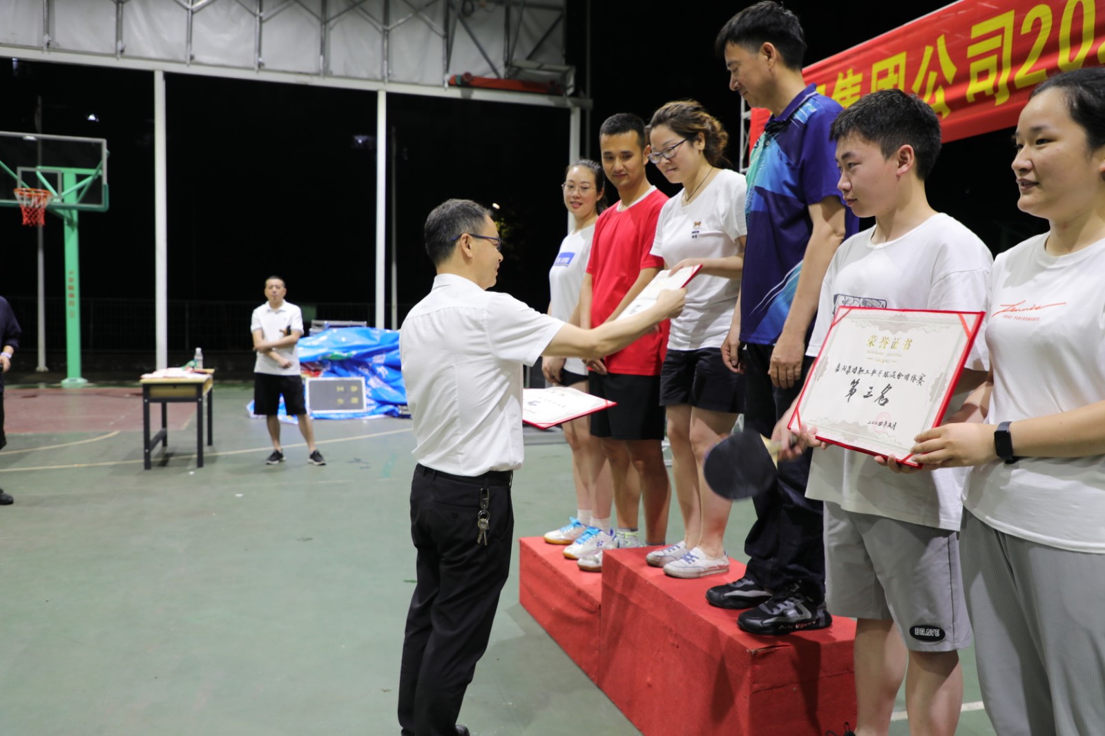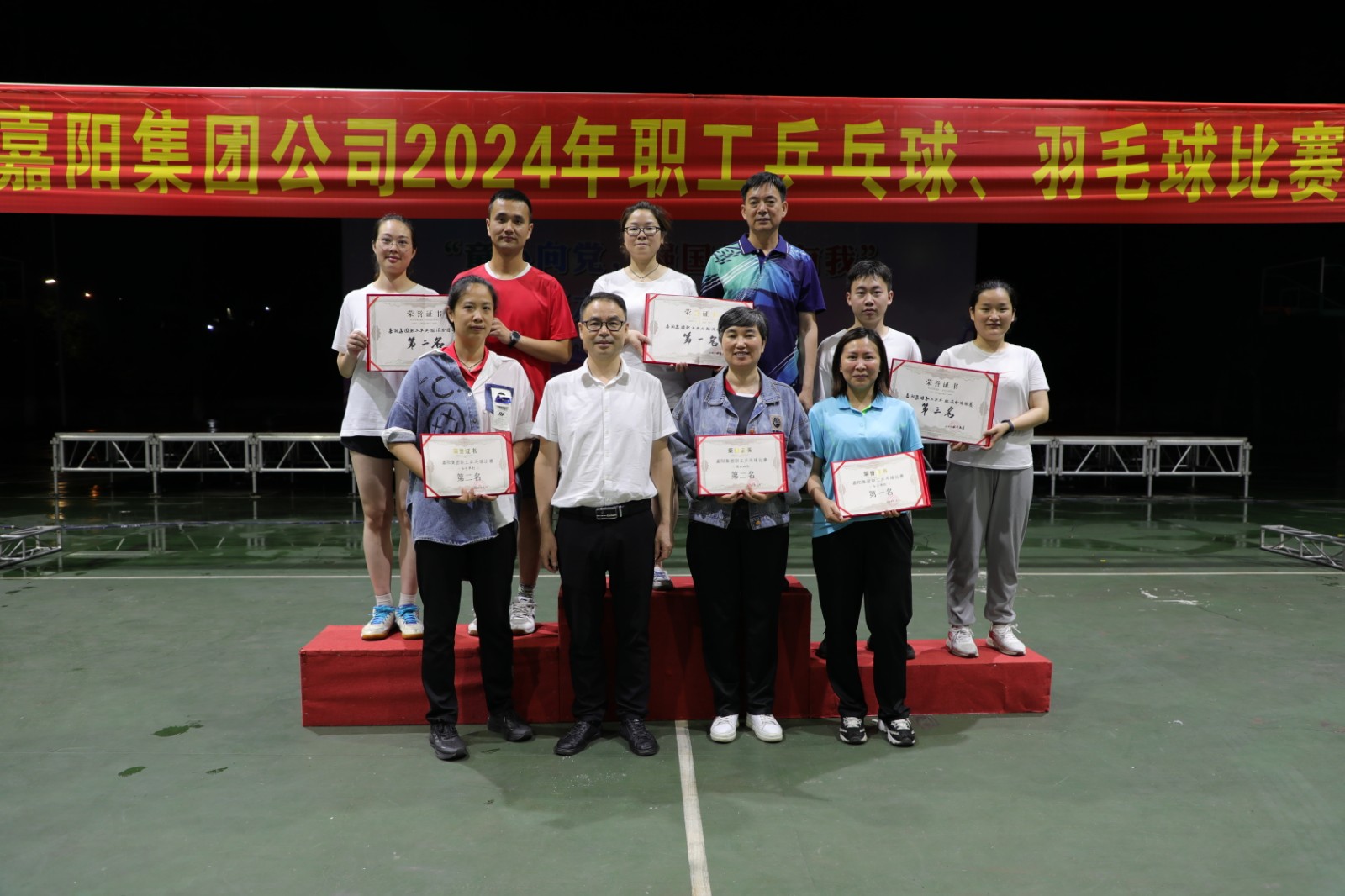 经过两天紧张激烈的一场场角逐,综合服务公司胡玲丽、宋燕获得精英赛女子单打冠亚军,男子单打冠亚军由嘉阳煤矿秦刚、汪成富夺得,胡玲丽、秦刚斩获混合双打冠军,混合团体赛前三甲是嘉阳煤矿一队、川投峨旅公司、公司机关。集团公司纪委书记吕明强为获奖运动员们颁奖。