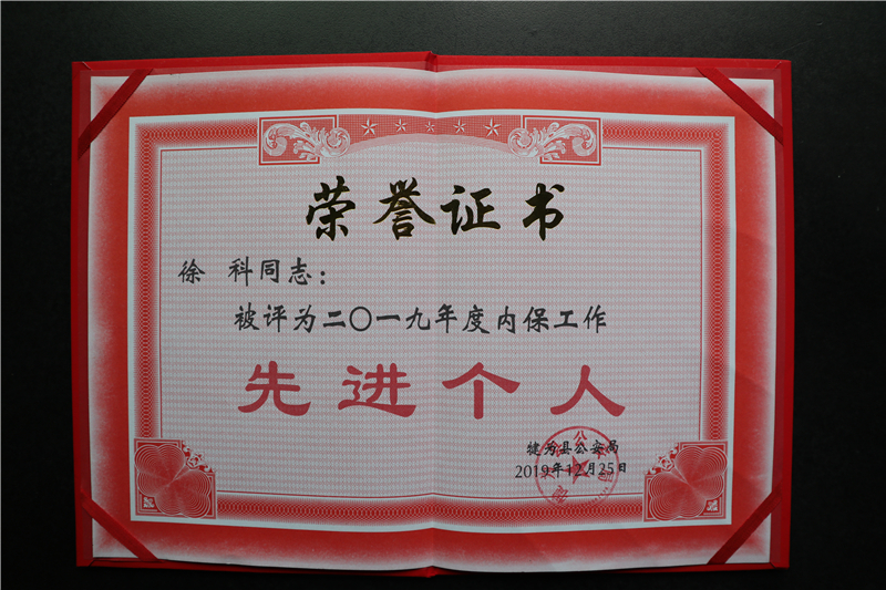 12月24日,犍为县公安局对2019年度单位内部治安保卫工作先进集体和个人进行表彰,乐竞体育,乐竞(中国)单位榜上有名,被授予2019年度内保工作先进集体荣誉称号,保卫部徐科同志被评为2019年度内保工作先进个人。