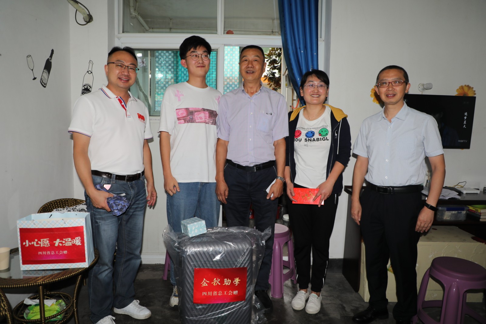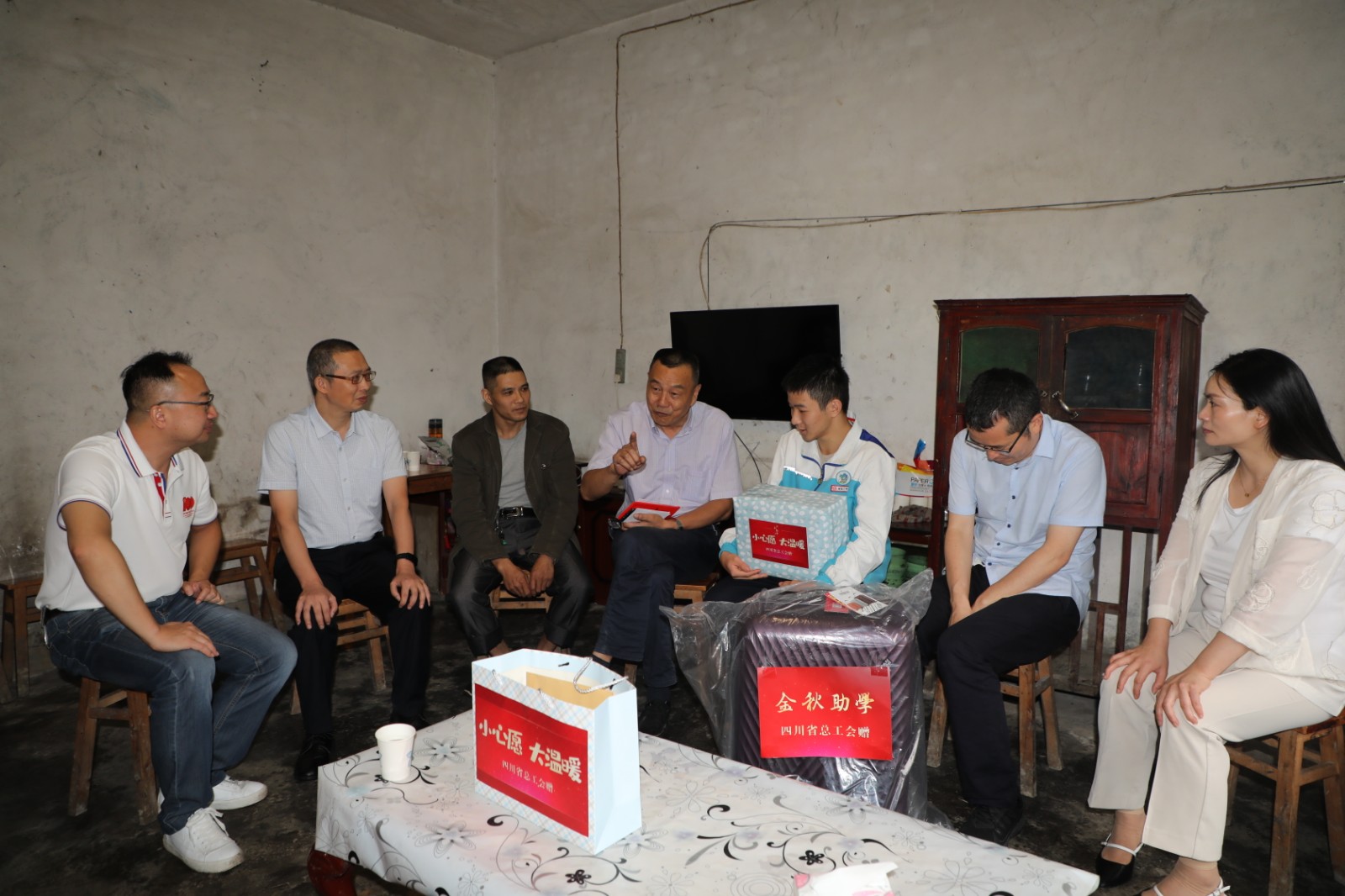 8月26日,四川省总工会二级巡视员陈黎一行冒着细雨来到嘉阳困难职工家庭,看望慰问即将入学的贫困大学生,为他们送去组织的关心和问候。