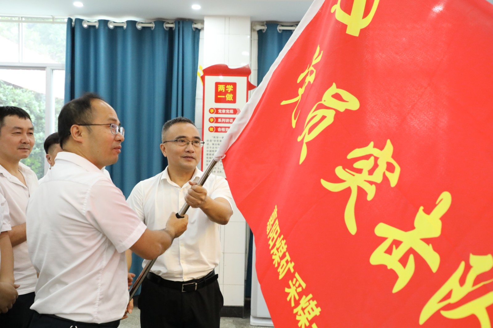 党委书记杜勤将印有“党员突击队”大字的崭新旗帜郑重授予采煤一队党支部书记黄建,希望党支部高举旗帜,团结全体党员携手前行,以更加饱满的热情在企业高质量发展征程上再创佳绩。