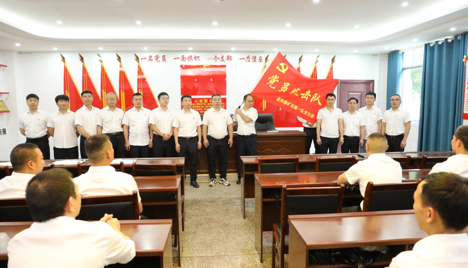 你们是不畏艰险的生力军……”6月15日,嘉阳煤矿采煤一队党支部在党群活动室举行“党员突击队”授旗仪式,深入推进主题教育走深走实,公司党委书记、董事长杜勤授予党支部“党员突击队”旗帜,为党员干部添信心、鼓干劲,号召全体党员强化示范引领,团结职工再建新功。
